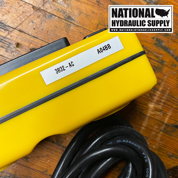 This SPX Stone/Fenner 4-wire handset controller is used on a variety of hydraulic power units. Part number (3832-AC) works with pumps/power units on a variety of applications including snow plows, lifts, hoists, presses, dump trailers, landscaping trailers, bale spikes, etc. It is designed for use with double-acting hydraulic units requiring a 4-wire connection with ring terminals. The pendant control has a 10′ cord for plenty of mobility. D/C voltage only.