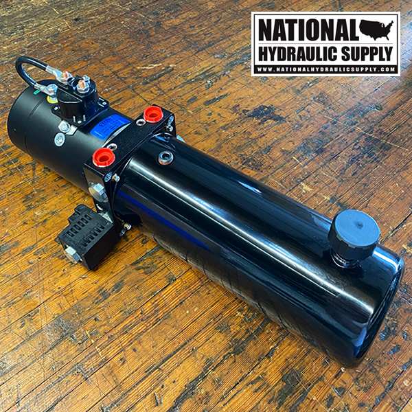 SPX Stone/Fenner 12V DC solenoid-operated power up/power down hydraulic bale spike power unit. Designed primarily to operate tines which pick up round bales. This unit incorporates a 2-position, 4-way cartridge valve & double pilot-operated checks to control a double-acting cylinder, to lift-hold-lower the bale.
